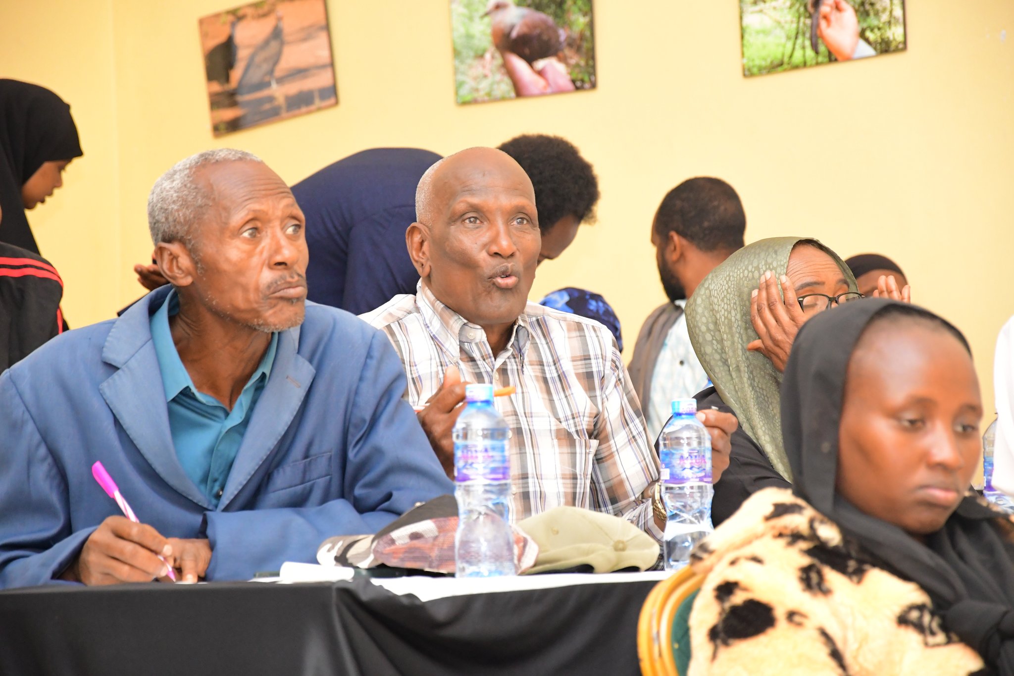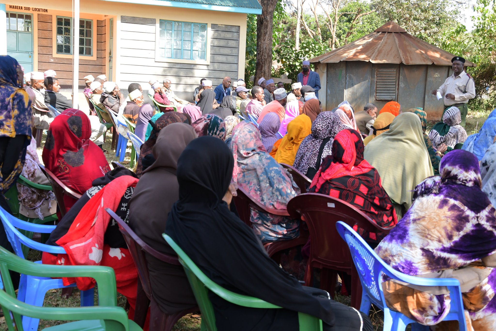 Hussein Galgalo, Chief Mountain Location dressing residents during a chiefs baraza. Mwado works with local leaders to conduct sensitization campaigns during events like chiefs baraza. The baraza's serve as critical platforms to build community understanding, stimulate conversations on rights, and strengthen local accountability for protection issues affecting women, girls, and children.