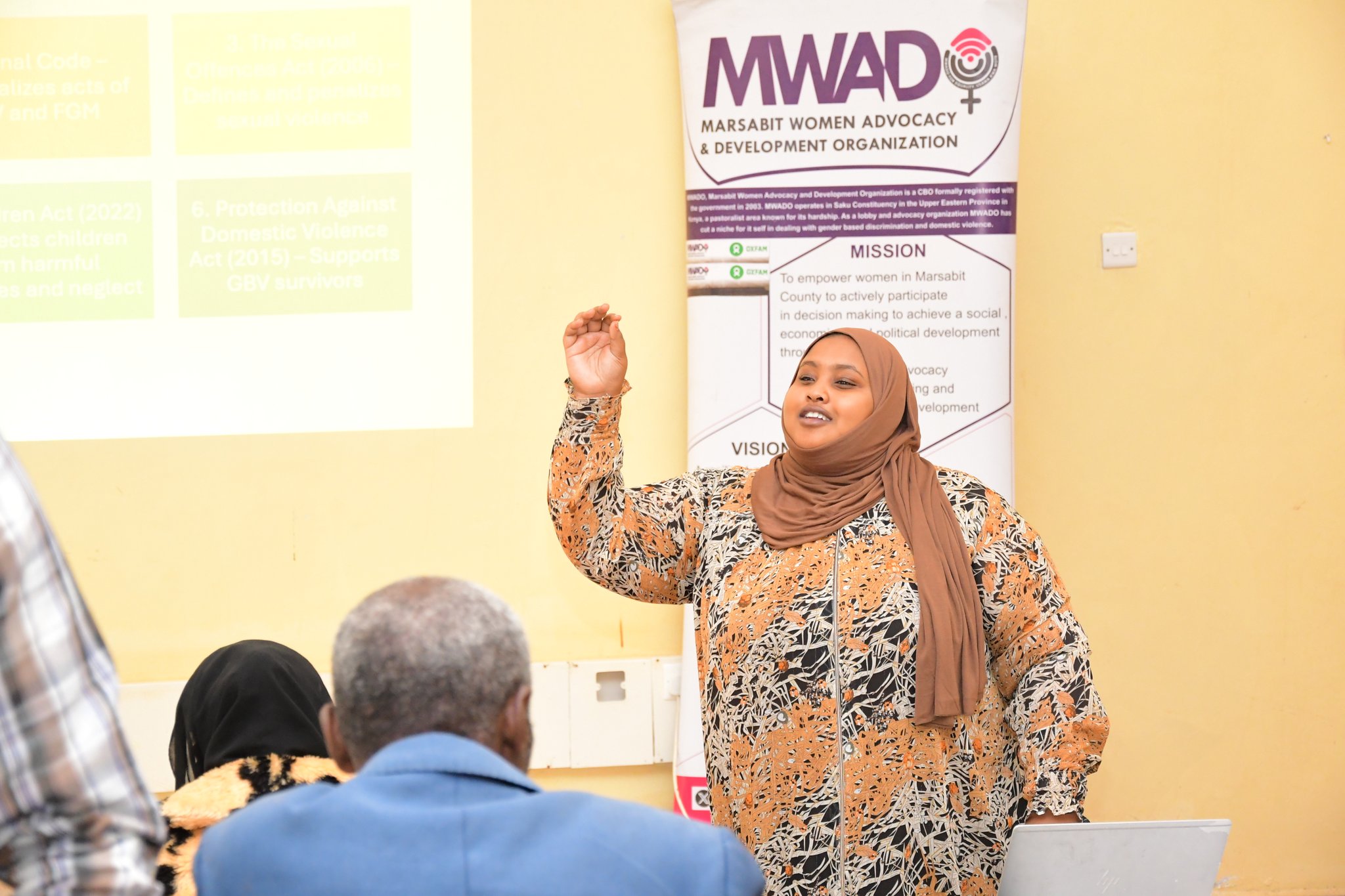 Mwado Project Lead Sulekha abdulkadir adressing participants during training for first line responders in Saku subcounty.The training on policies and legal frameworks of gender-based violence,FGM and Earlt Marriage.